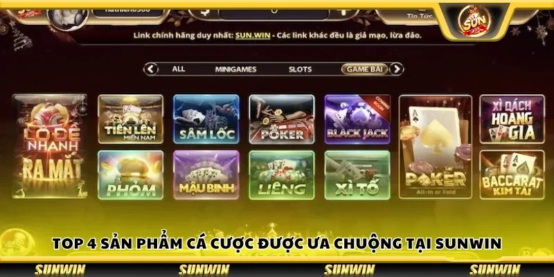 Sun win cung cấp nhiều trò chơi đa dạng, nhưng nổi bật nhất vẫn là 4 sản phẩm cá cược sau đây, thu hút đông đảo người chơi nhờ cách chơi đơn giản, hấp dẫn và tỷ lệ thưởng cao.