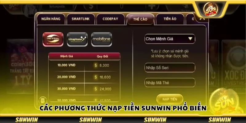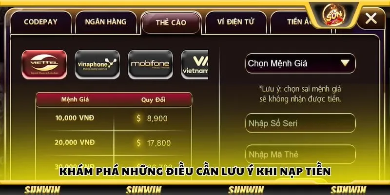- Nạp tiền bằng thẻ cào điện thoại: Nếu không có tài khoản ngân hàng hay ví điện tử, bạn vẫn có thể nạp tiền Sunwin bằng thẻ cào. Các nhà mạng lớn như Vinaphone, Viettel, Mobifone đều được chấp nhận. Tuy nhiên, phương thức này thường có mức chiết khấu cao hơn so với các cách khác.